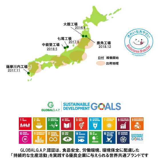 GGAPとは、「食品安全」「労働環境」「環境保全」の実施を通じて、食の安全と持続可能な生産活動を実行する優良企業に与えられる世界共通ブランドです。現在、120ヵ国以上に普及しており、事実上の国際標準となっています。当社が掲げる基本方針「安心・安全な野菜の安定供給を通じた地方の活性化と業務用・加工用市場で革新を起こす」に基づいて、国際標準での品質や信頼性を確保するため、今後もGGAPのルールに則った運用を実践してまいります。