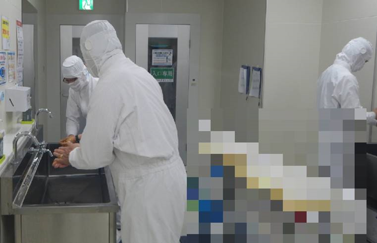 工場では、工場建屋玄関で服等についた埃やゴミくずを持ち込まない為の作業や、アルコール消毒、体温測定等、複数のステップを経て入室する