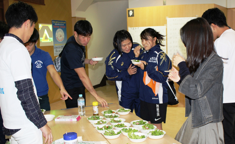 休憩中には、出場選手や応援団、関係者の方向けに弊社の植物工場で生産されているレタスを使用したサラダの試食会を実施しました。フレッシュなレタスを使用したサラダは大変好評で、おかわりされる方も見受けられました。